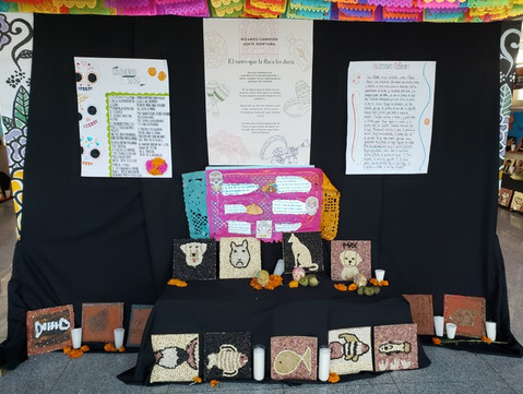 La Ofrenda se dedicó a las mascotas que ya han partido dejando recuerdos y cariño, y es justamente por todo el amor que brindaron, que no hay que olvidarlas. Los alumnos de Preescolar, Primaria y Secundaria aportaron con obras, el recuerdo de sus seres queridos, algunos peludos y otros con escamas y caparazones.
