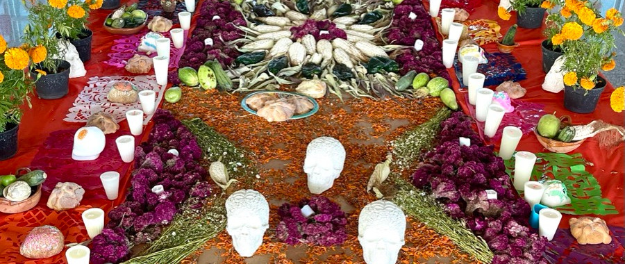 Al centro, una catrina monumental se alza como símbolo de la dualidad entre la muerte y la vida, recordándonos que ambas forman parte del mismo ciclo. A su alrededor, los niveles del altar están decorados con los elementos tradicionales: flores de cempasúchil y terciopelo, nubes, pan de muerto, veladoras, papel picado, calaveritas de azúcar y amaranto, así como incienso y copal, que purifican el ambiente y guían el camino de las almas.